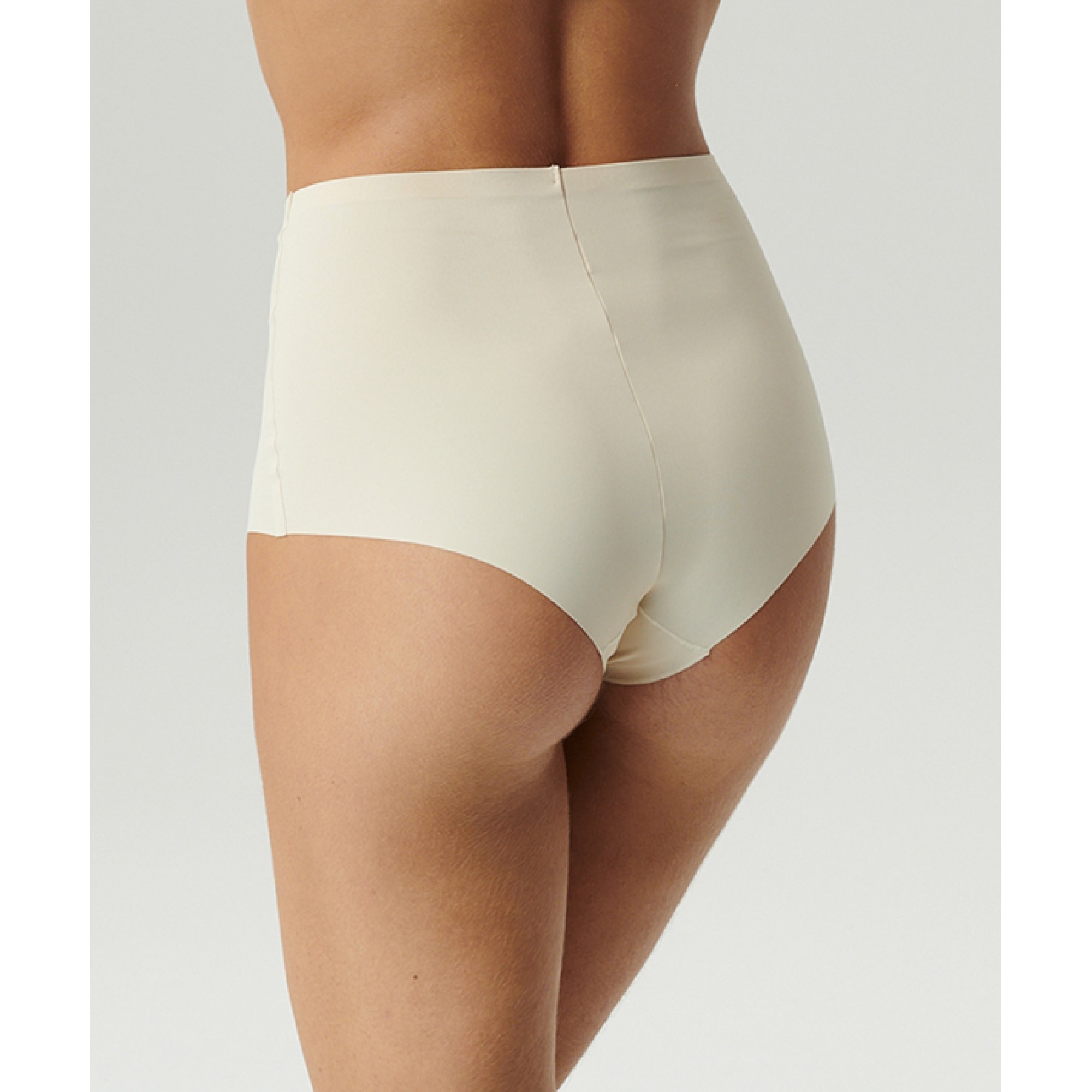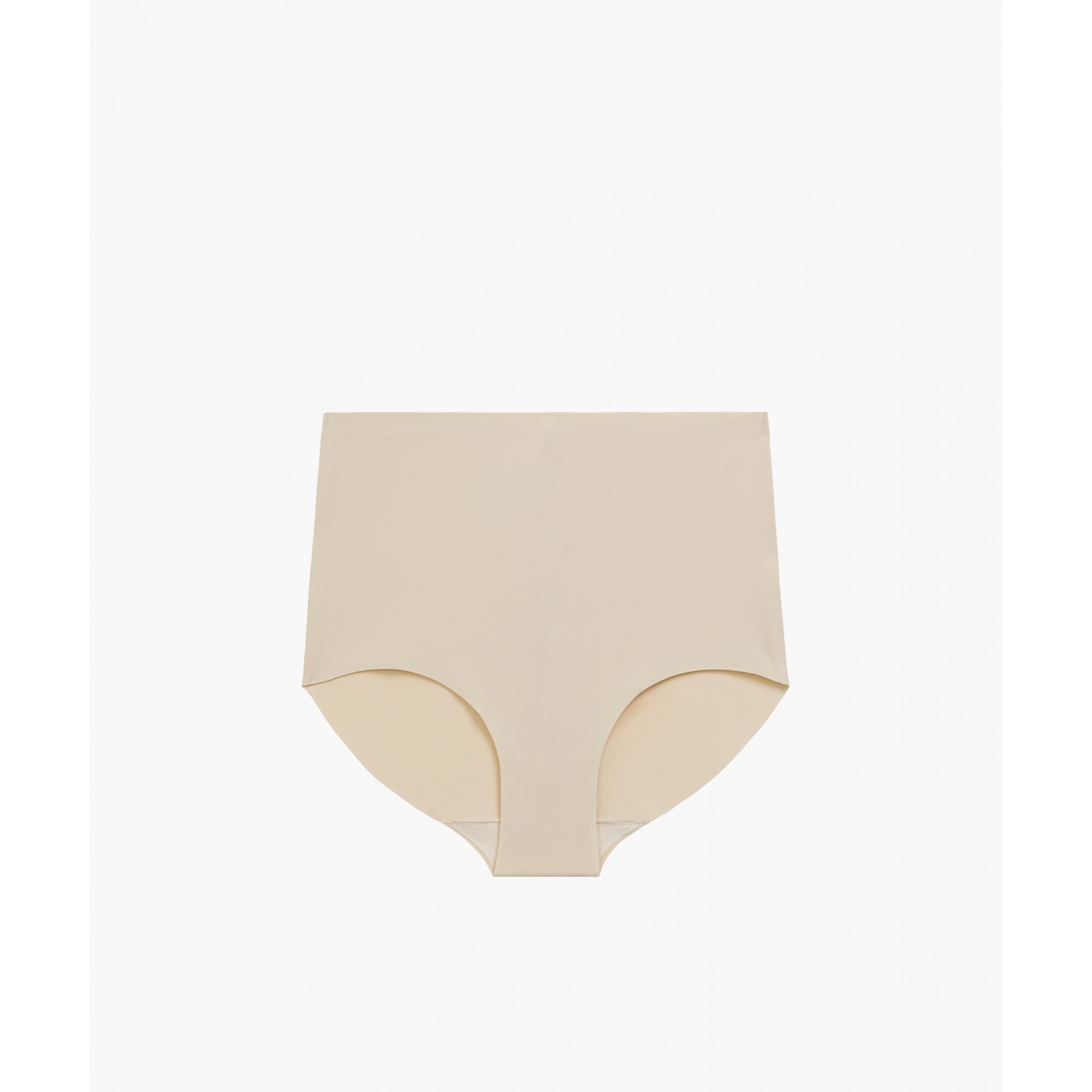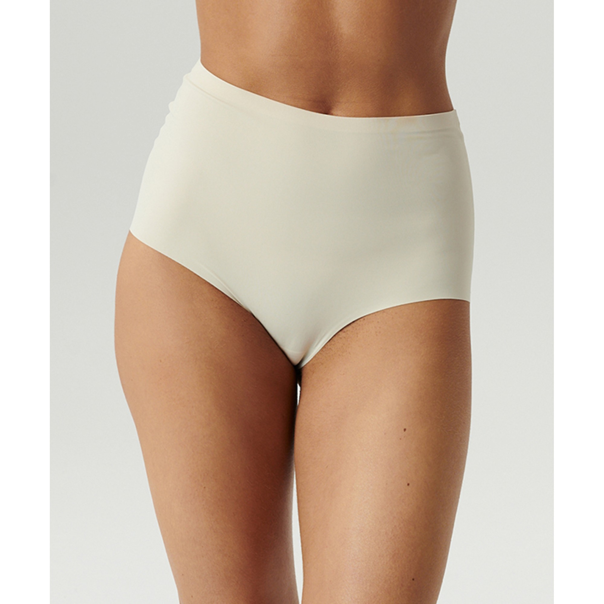 Трусы с высокой посадкой, светло-бежевого цвета, с широкими боковыми сторонами и полностью закрывают ягодицы, обеспечивая комфорт и поддержку. Они изготовлены из эластичного материала на основе смеси нейлона и эластана – эта ткань не стесняет движений, при этом гладкая, мягкая и быстросохнущая. Кроме того, она устойчива к изнашиванию и частой стирке.
